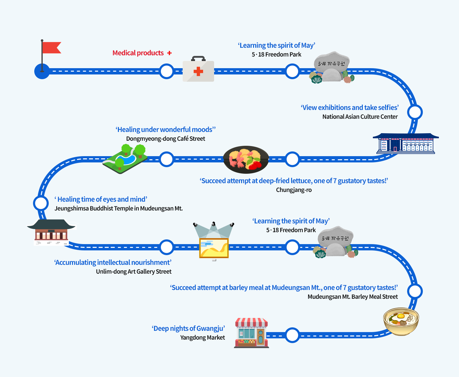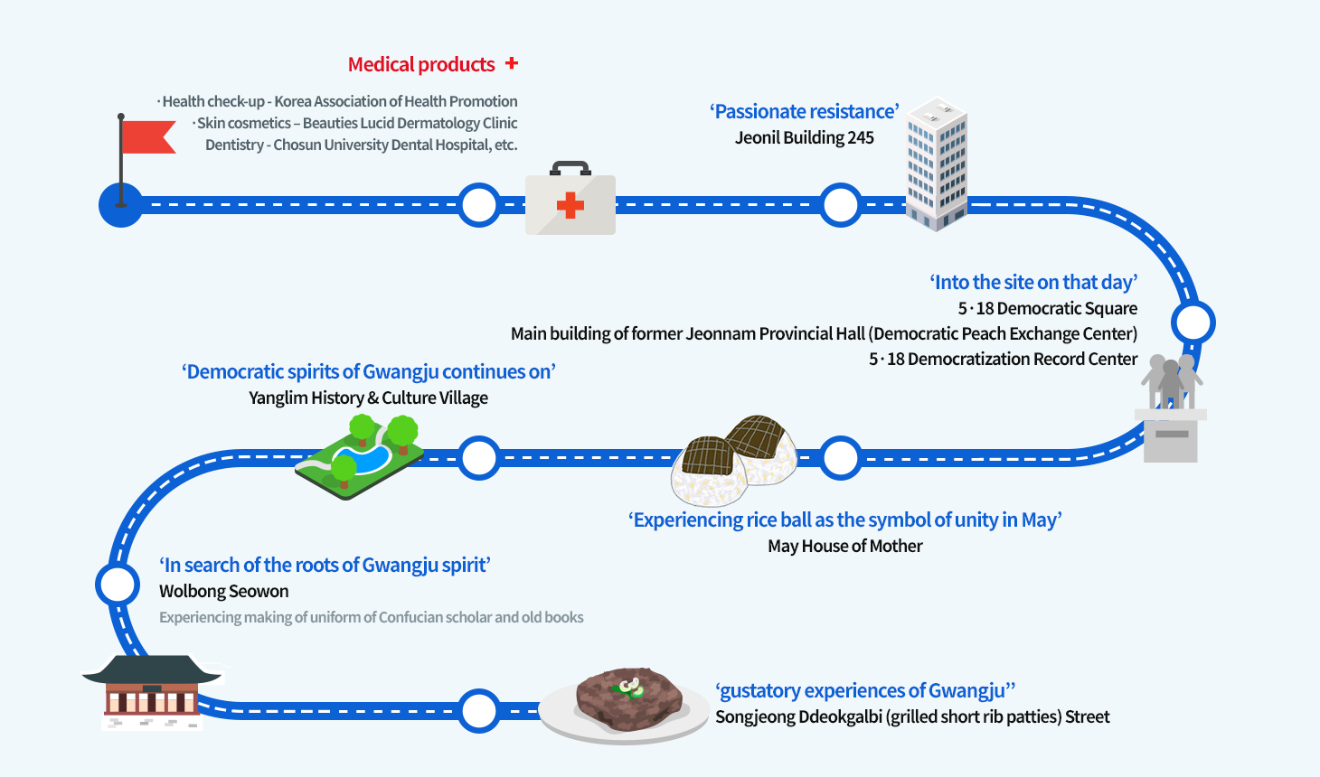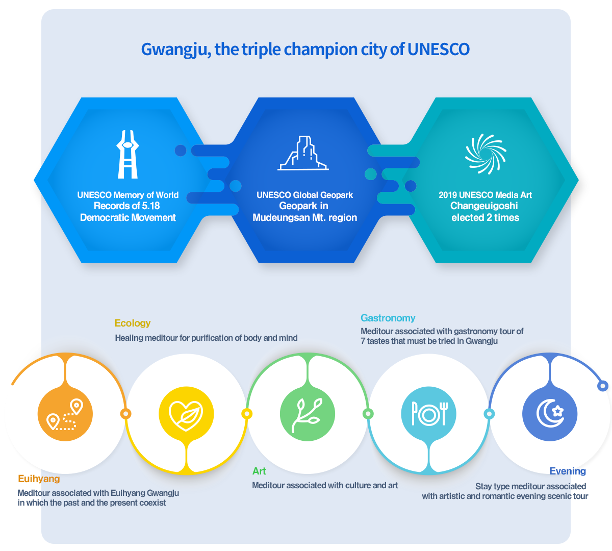 | Tourism products | Storytelling-based Euihyang Gwangju medi-tour - ‘Tour for experiencing the spiritual trend of Gwangju that has been continuing over several hundreds of years including ‘loyal troops of Japanese Invasion of Korea in 1592’, ‘loyal troops at the end of the Korean Empire’, ‘Gwangju students’ movement during Japanese occupation’ and ‘5·18 Gwangju Democratic Movement’, etc. |