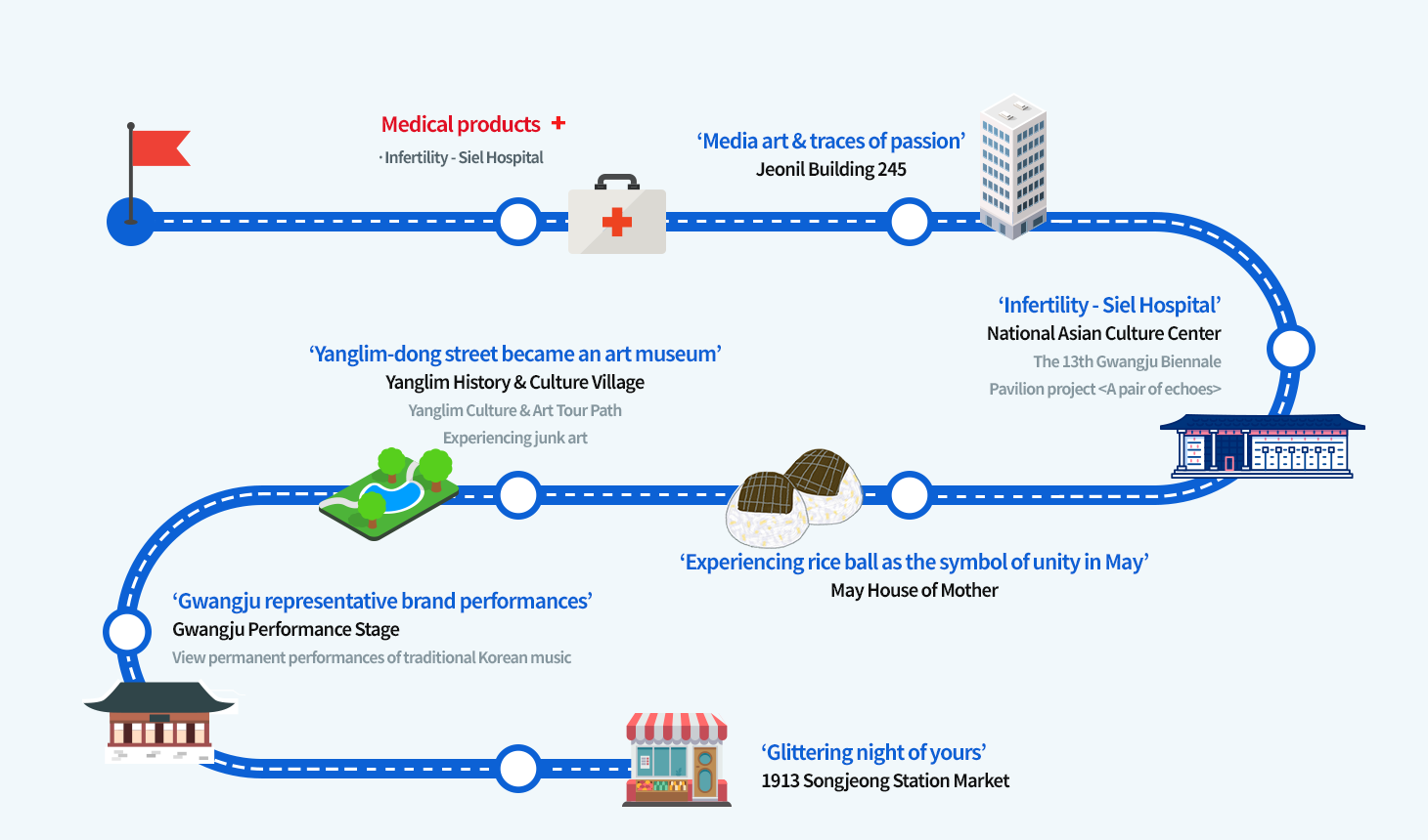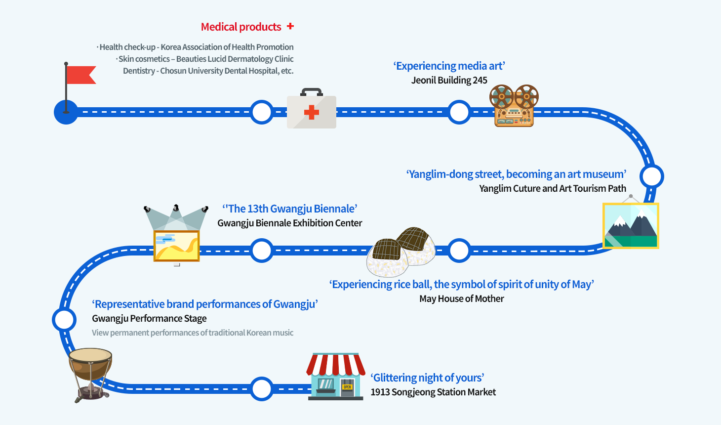 | Tourism products | Night tour using media art - Enjoy diversified media art programs of UNESCO Media Art Creative City * Space 5G Ne (Bitgoeul Citizen Cultural Center), Media Art Platform, Media Art Façade (installation of outer wall of Media Art Platform), etc. - Enjoying View Foly, Media Wall, and night tourist destinations including night markets inn association with traditional markets (South Gwangju Market and Daein Market) |