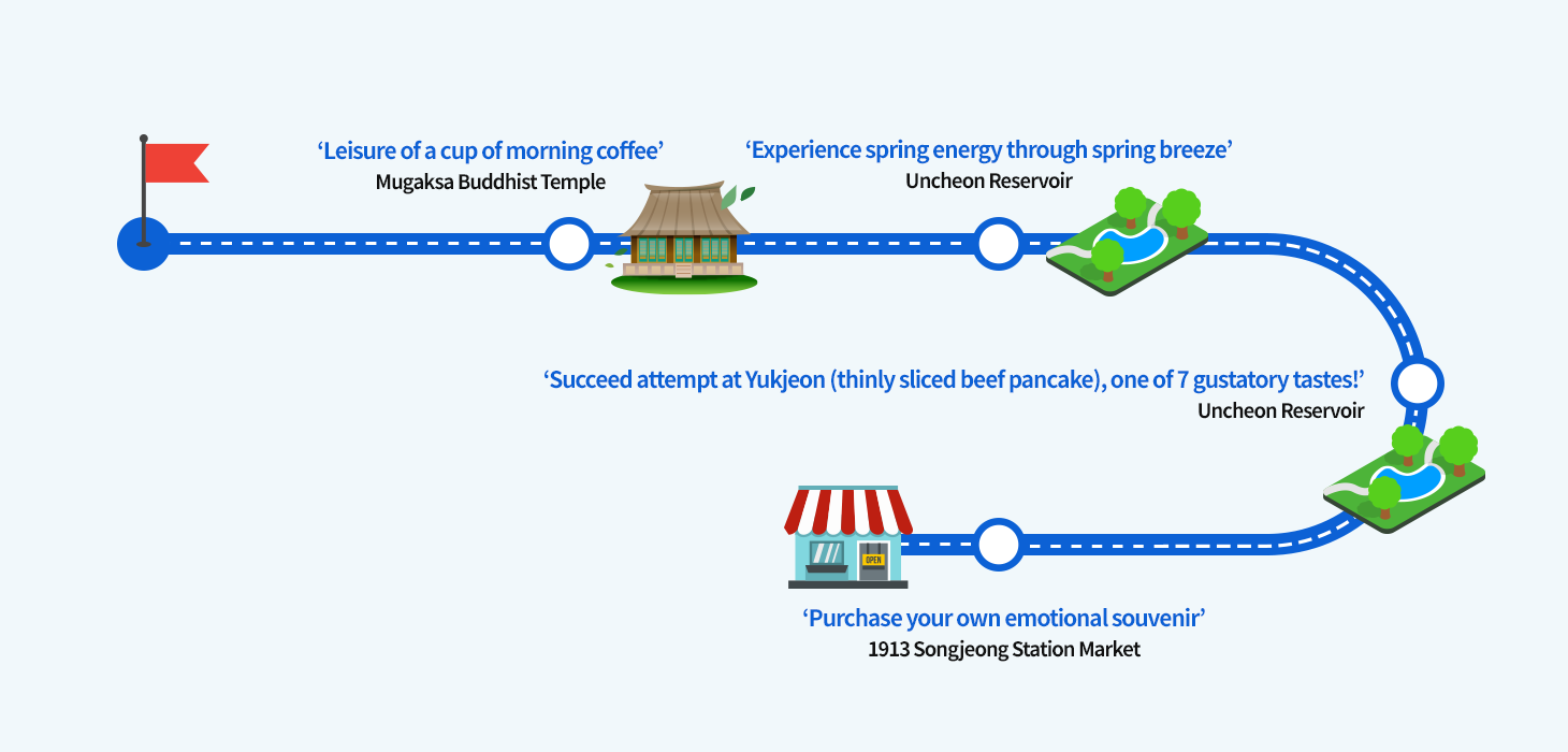 | Tourism products | Urban type healing product using ecological resources of Gwangju - ‘Walking tour’ linking villages including lake ecology center, Mudolgil, Wonhyosa Buddhist Temple and Jisan recreational area through development of Gwangju type healing contents to overcome COVID-19 blues - Contact-free tourist destinations selected by the Korea Tourism Organization (Wolbong Seowon, Yeongsangang Geukrak Chinsu Park) |