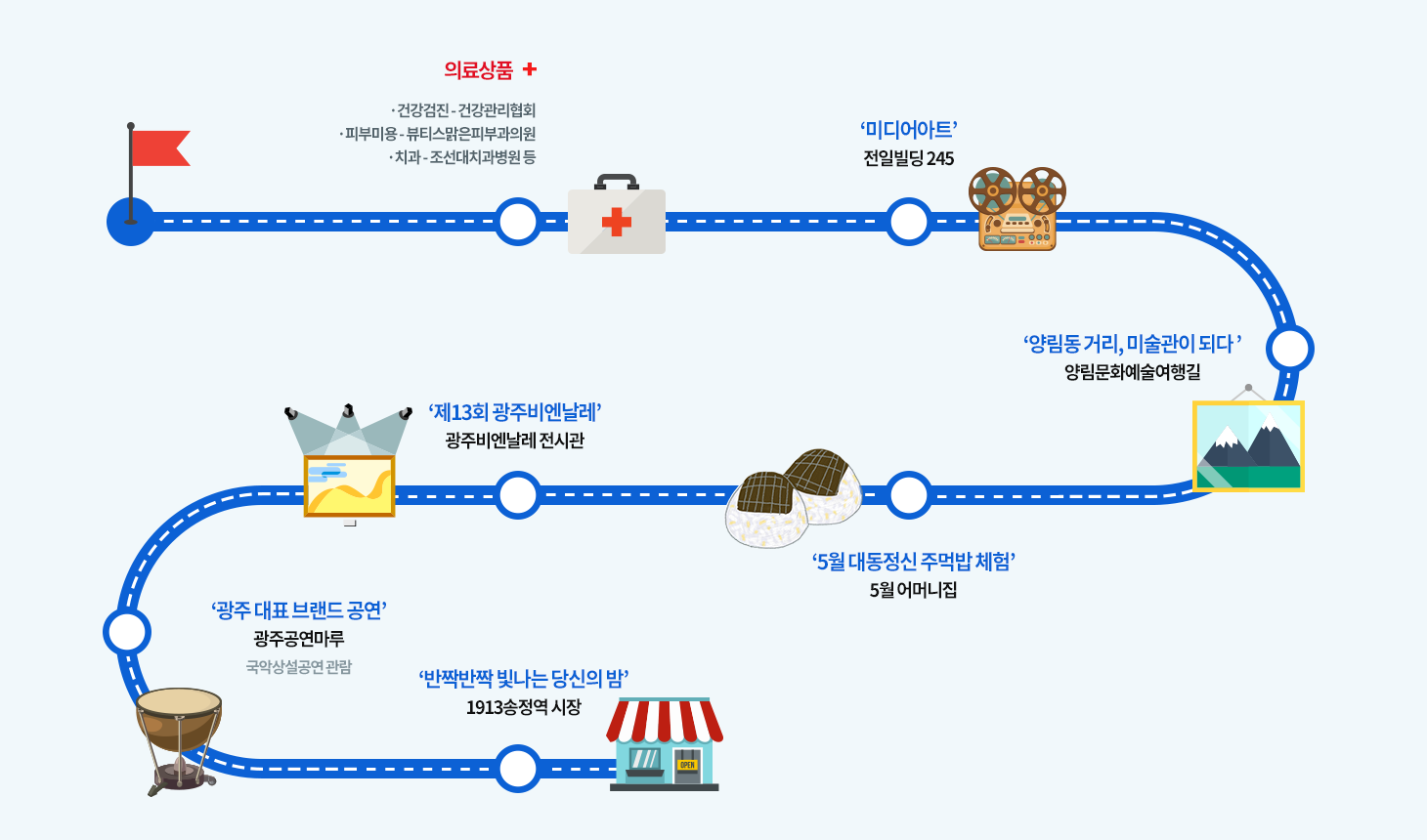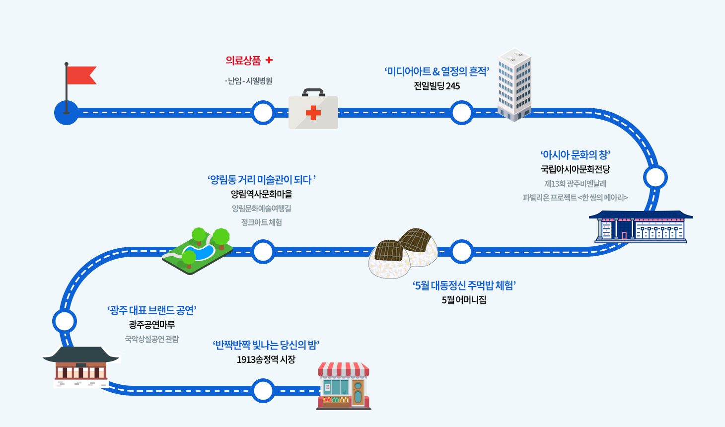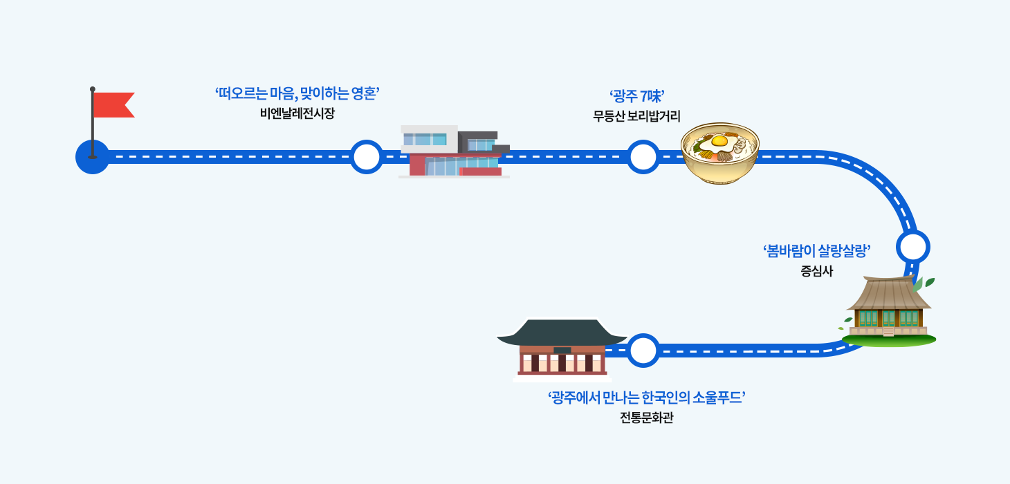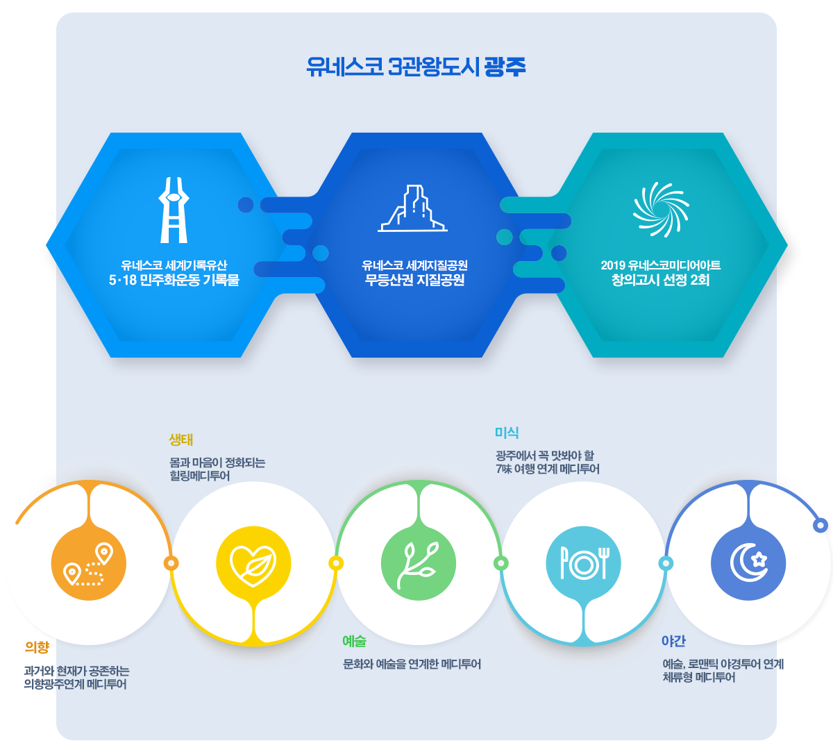 | 관광상품 | 광주 고유의 예술성을 활용한 콘텐츠 - 국립아시아문화전당(ACC)을 중심으로 하는 ‘아시아문화중심도시’ - 빛의 도시 광주는 세계가 인정하는 ‘유네스코 미디어아트 창의도시’ - 광주비엔날레, 양림역사문화마을 등 전시, 공연, 체험이 가능한 다양한 형태의 예술여행 |