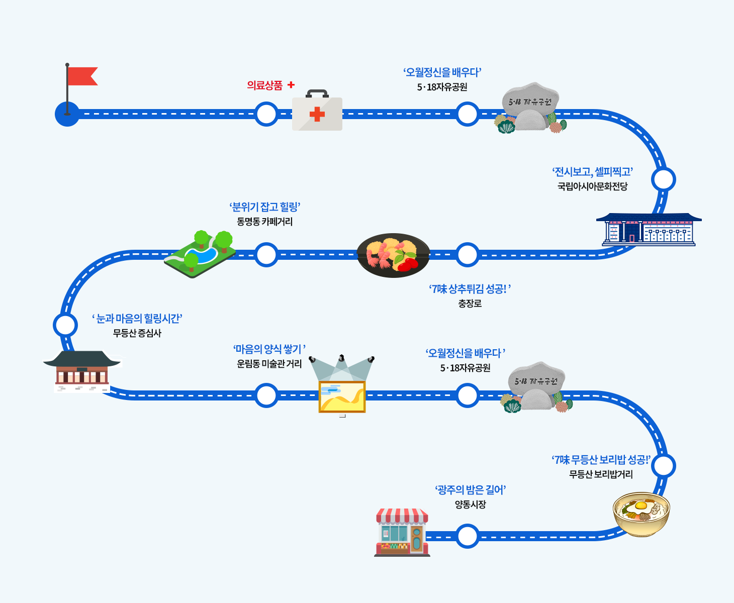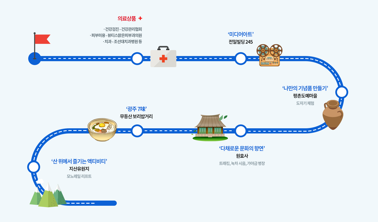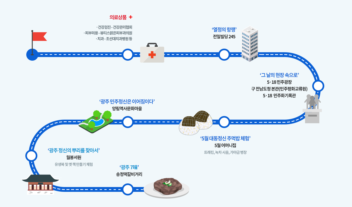 | 관광상품 | 스토리텔링 기반 의향광주 메디투어 - ‘임진왜란 의병’, ‘한말 의병’, ‘일제강점기 광주학생운동’ 그리고 ‘5·18 광주 민주화 운동’ 등 수백 년 전부터 내려온 광주의 정신사적 흐름을 느끼는 투어 |